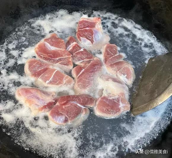 2. 猪瘦肉切成小块,冷水下锅,加一片生姜焯水,撇去表面的浮沫后捞出,用温水冲洗干净;