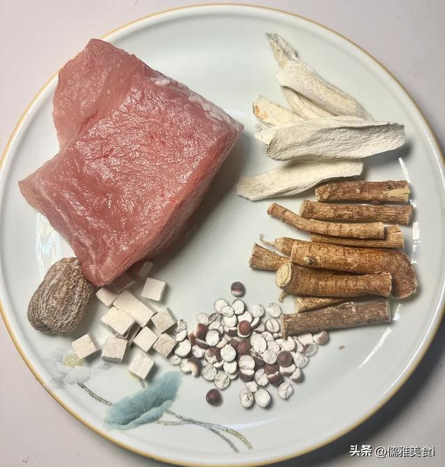 准备食材:猪瘦肉200克、芡实15克、干山药10克、莲子15克、茯苓10克、生姜2片、食盐少许